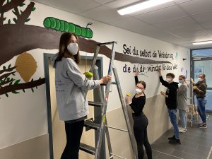 Im Rahmen eines Kunstprojektes planen und erstellen SchülerInnen der 9f zusammen mit der Kunstlehrerin Frau Müller eine Wandmalerei.