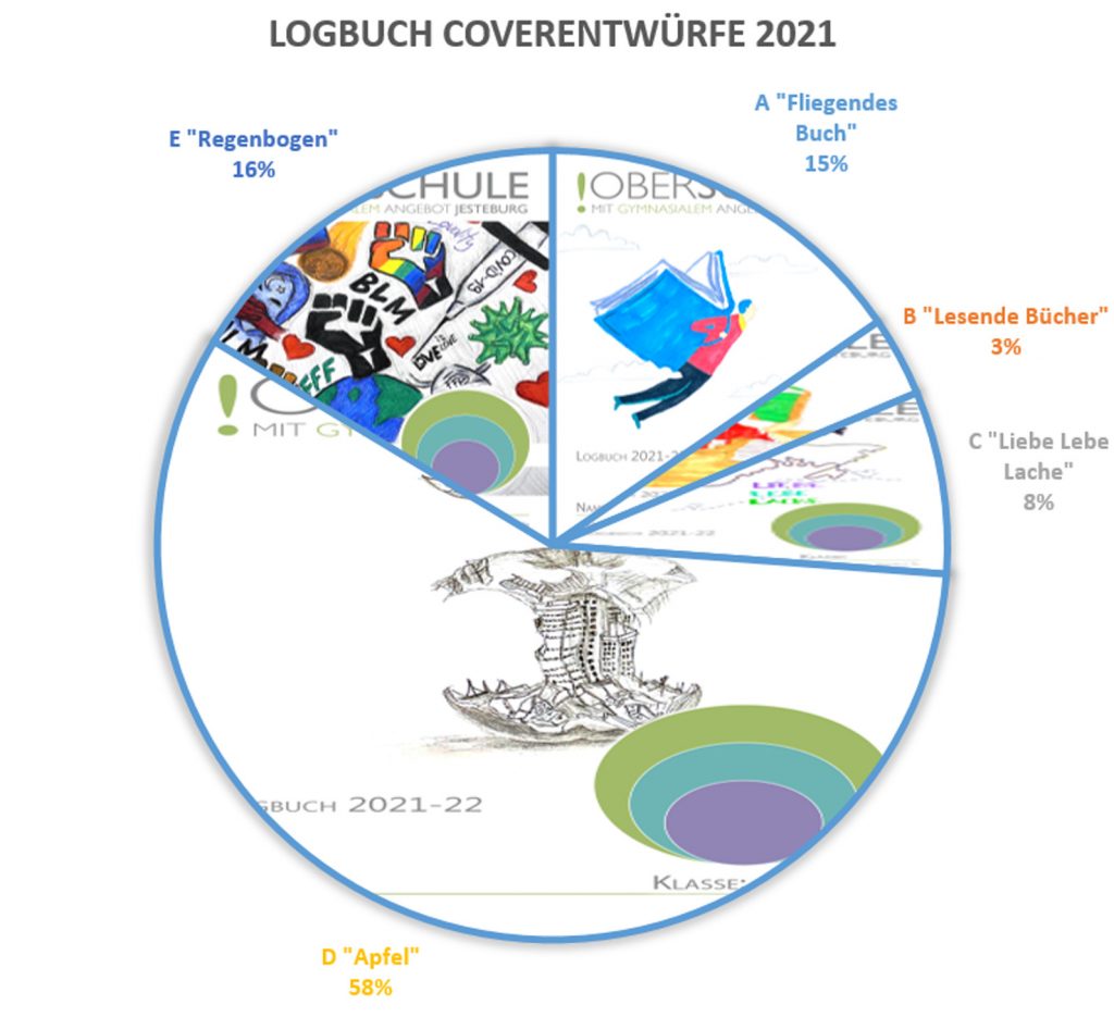 Vielen Dank für die Teilnahme an der Abstimmung. Jetzt ist die Abstimmung beendet. Hier das Ergebnis der Abstimmung. Damit wird unser Logbuch für das Schuljahr 2021-22 der Entwurf D „Apfel“. Herzlichen Glückwunsch an Mia aus der Klasse 8d: