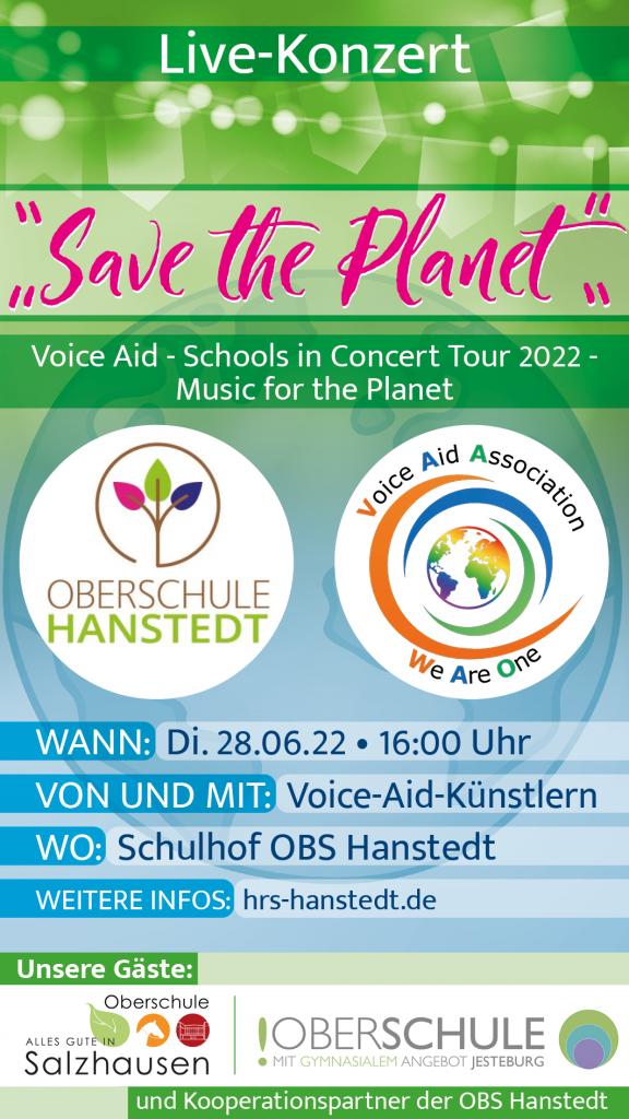 Unsere Schule wurde gemeinsam mit der Oberschule Salzhausen von der Oberschule Hanstedt zum „Voice Aid Concert“ am Dienstag, den 28.06., eingeladen. Wir freuen uns sehr auf dieses gemeinsame Erlebnis.