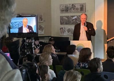 Die Oberschuldirektorin Frau Strunk berichtete wie aus einer kleinen Idee im letzten Herbst dieses Projekt entstanden ist und stellte heraus wie wichtig vor Ort das partnerschaftliche Engagement (Nachhaltigkeitsziel 17, 17ziele.de) mit kleinen Schritten und Beiträgen ist. Sie übergab das Wort an den Geographieprofessor Dr. Pries von der Universität Leuphana, der einen Überblick über die 17 Nachhaltigkeitsziele gab. Er forderte die Schüler:innen auf Informationen zu prüfen und zu hinterfragen. U.a. erklärte er, wann und warum der Apfel aus Südafrika den Apfel aus der Region hinsichtlich der CO2-Bilanz im Kalenderjahr schließlich überholt. Die Komplexität der Sachverhalte und der Mut zu Innovationen wurden deutlich.